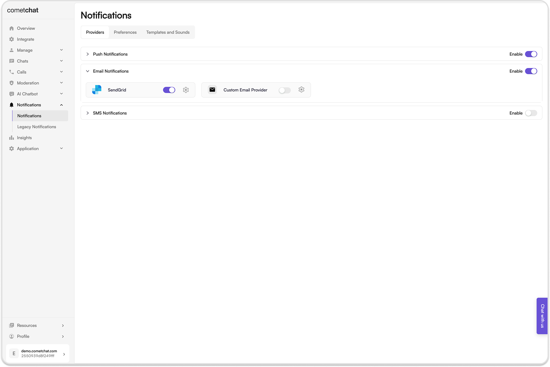 Email notifications integration is possible using SendGrid as a provider or a custom provider. Custom provider allows integration with providers other than SendGrid.