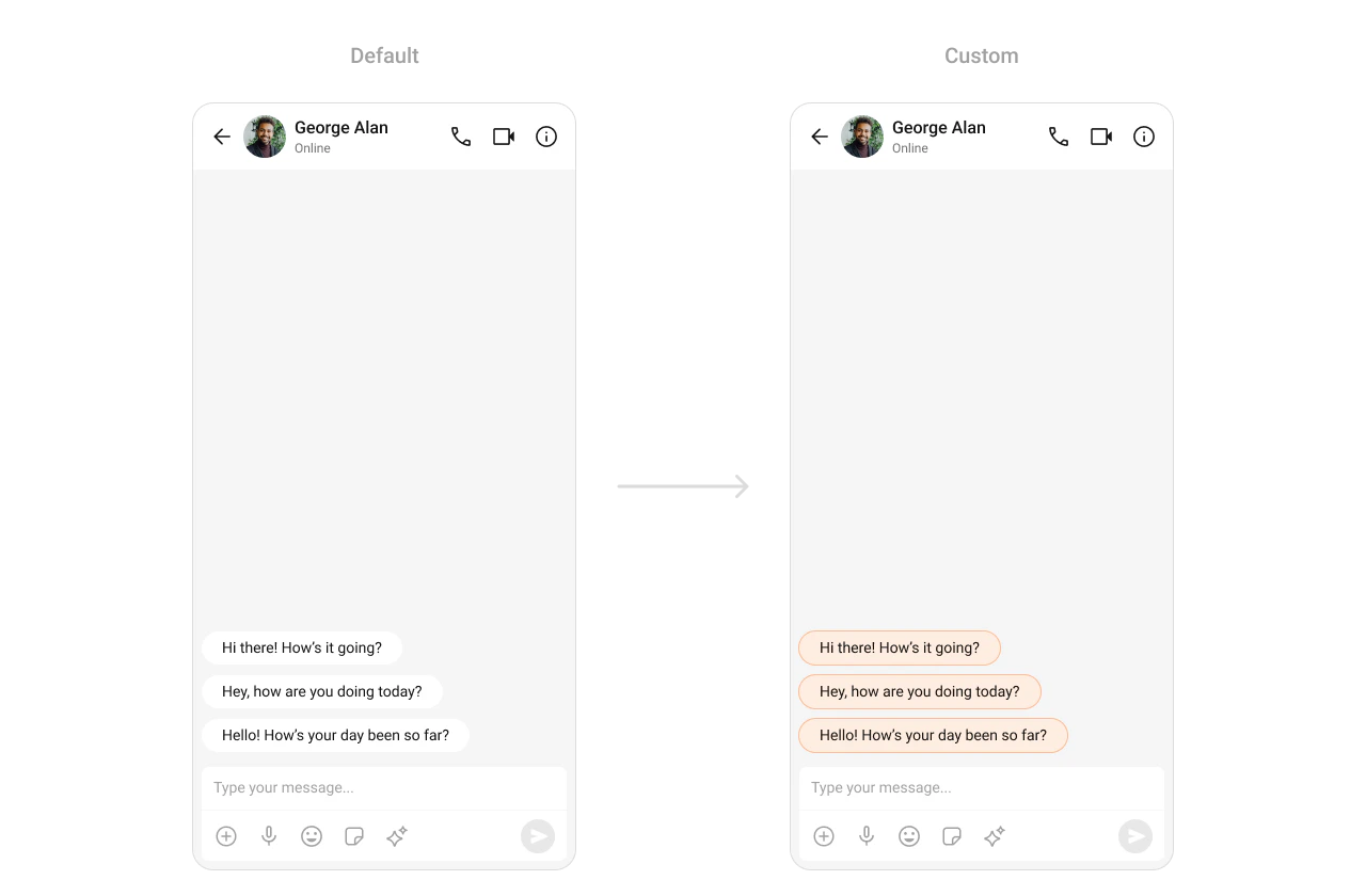 CometChat UIKit enables developers to seamlessly integrate customizable components into their applications. Each component is designed to ensure a consistent user experience while offering flexibility to adapt to your app’s design system. You can modify attributes such as colors, fonts, sizes, icons, and more using XML or programmatically. Below is a detailed guide for styling individual components within the UIKit.Components