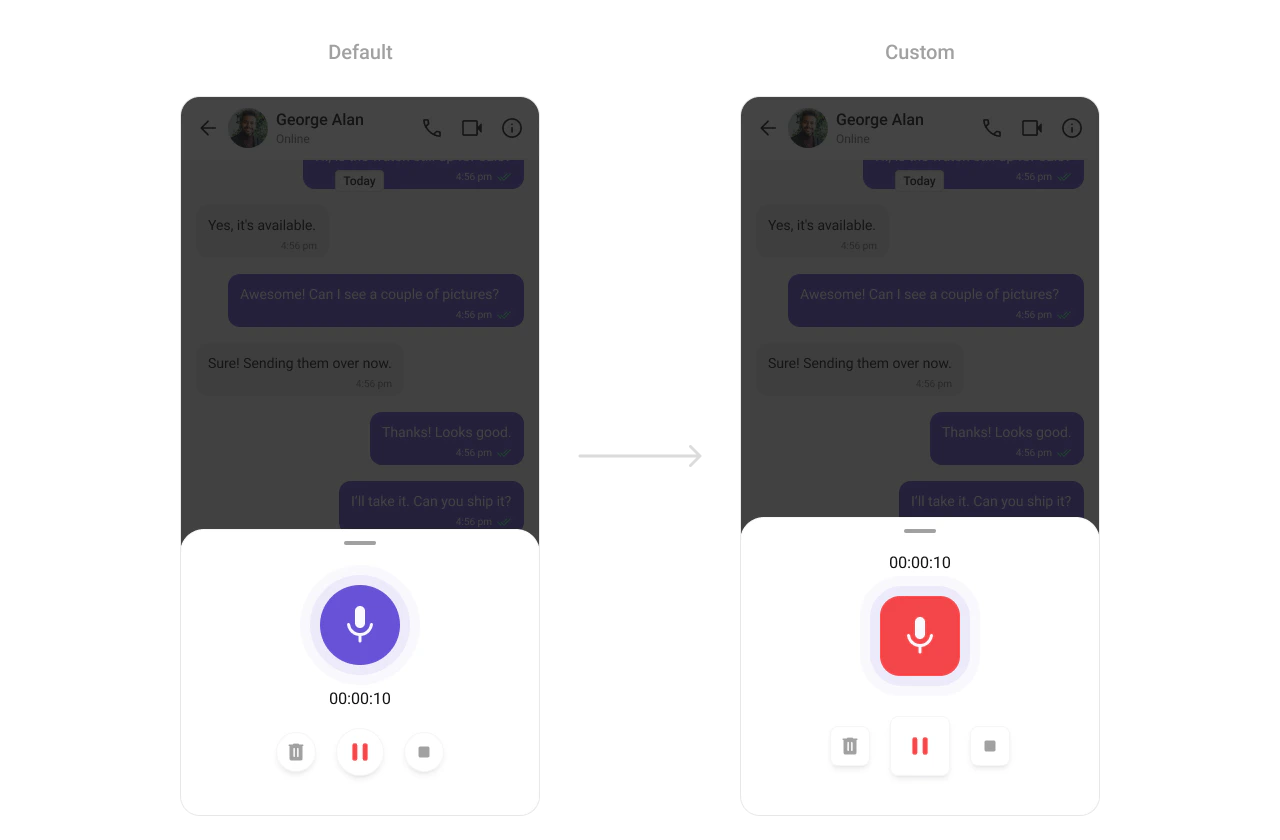 TheCometChatMediaRecorder Component facilitates the recording of audio and video messages. It supports full customization of its recording controls, including button sizes, shapes, and colors, making it an integral part of your media-rich chat experience.